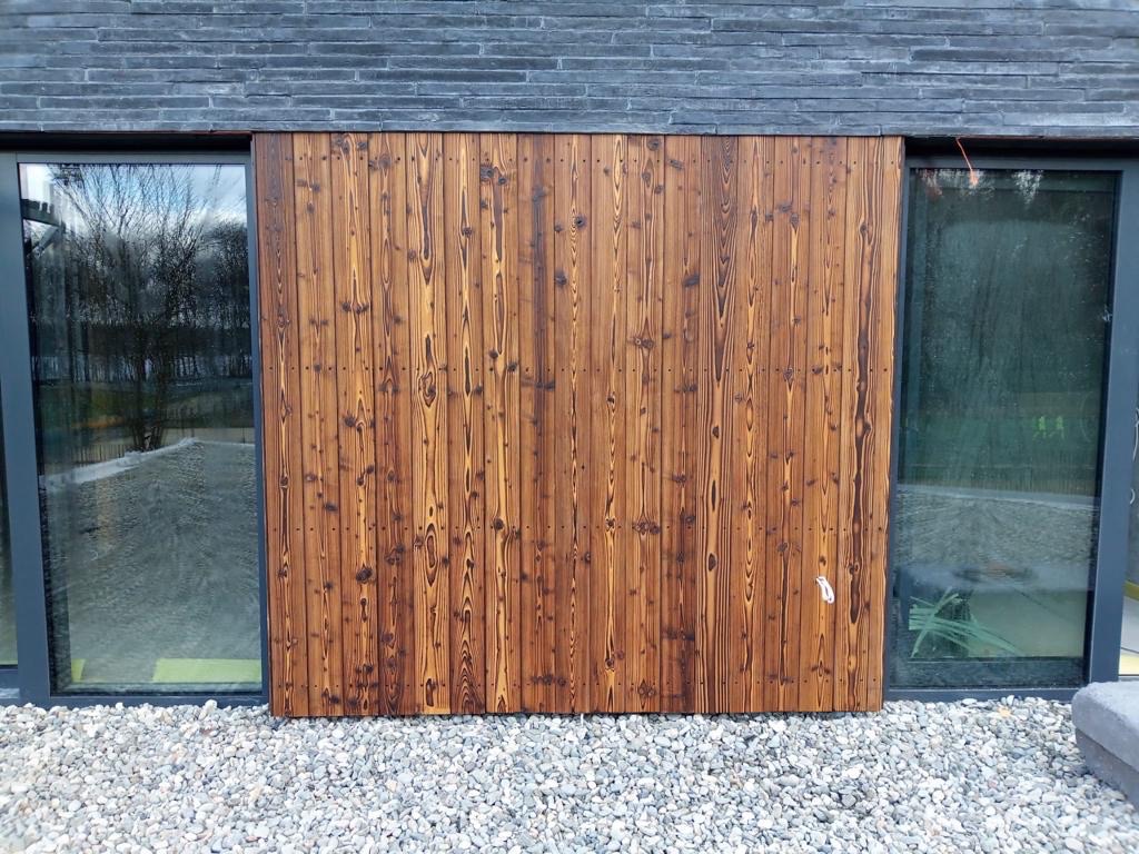 Die in der Variante BALTICA-1 gefertigtes Holzprofil ist verkohlt und dann stark gebürstet und imprägniert. So entsteht eine einzigartige Holzstruktur mit sichtbarer Maserung und Astlöchern. Je nach Art der Imprägnierung lassen sich bei BALTICA-1 verschiedene Hellbrauntöne erzielen (natur, larche, sand). Die ersten drei Fotos zeigen BALTICA-1 Holzprofile im Farbton larche.