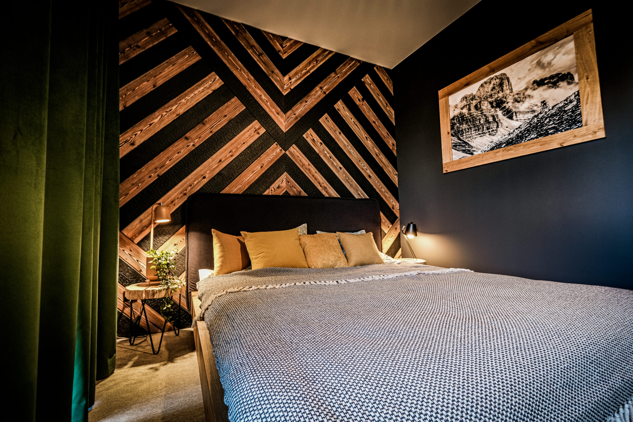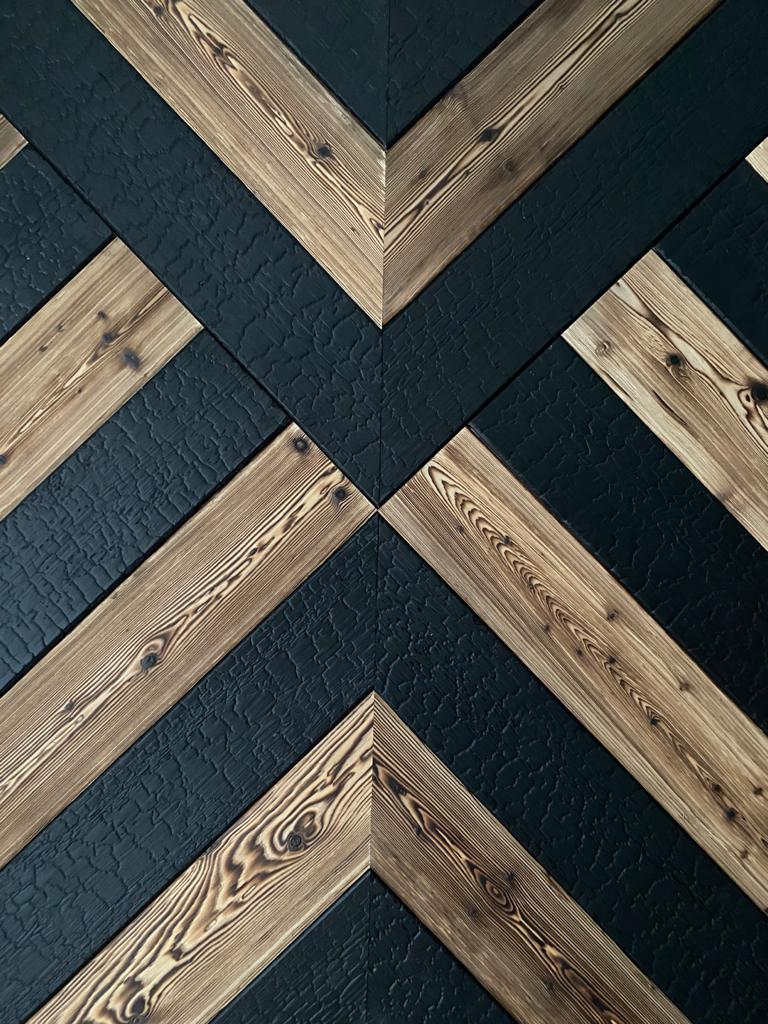Die auf den Fotos gezeigte Komposition ist das Ergebnis der Verkleidung einer der Wände der Riders Lodge Wohnungs mit verkohlte Holzprofile durch die Designer von Razoo Architects. Für die Gestaltung wurden die schwarzen KARPATIA-1 und die braunen BALTICA-1 verwendet.