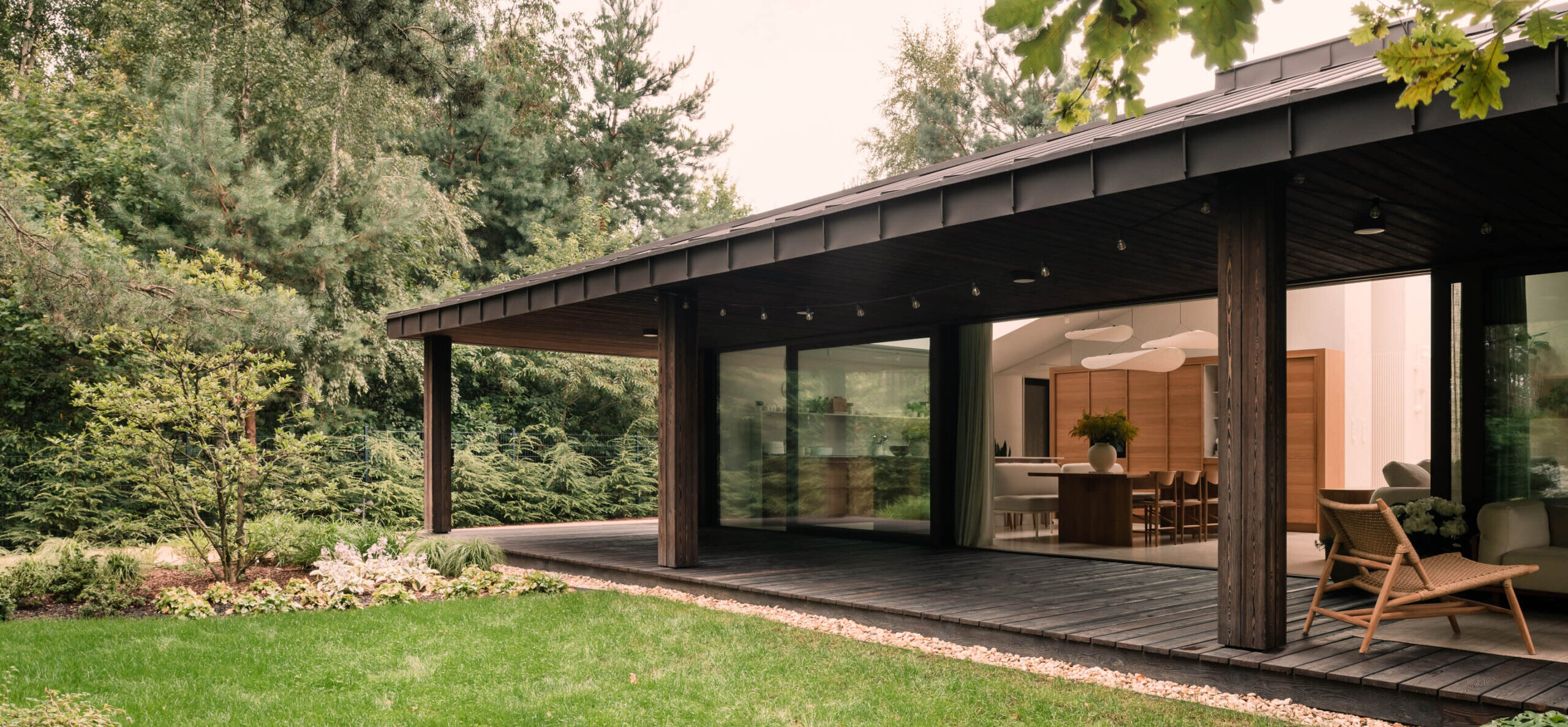Eine gebrannte Terrasse kann eine Erweiterung einer gebrannten Fassade sein oder, andersherum, ein kontrastreiches Element zu ihr. Die Wahl der richtigen Holzart (z.B. Lärche) und eine gelegentliche, regelmäßige Imprägnierung der Bretter gewährleisten, dass eine gebrannte Holzterrasse jahrelang ihren Zweck erfüllt und dem Auge gefällt.